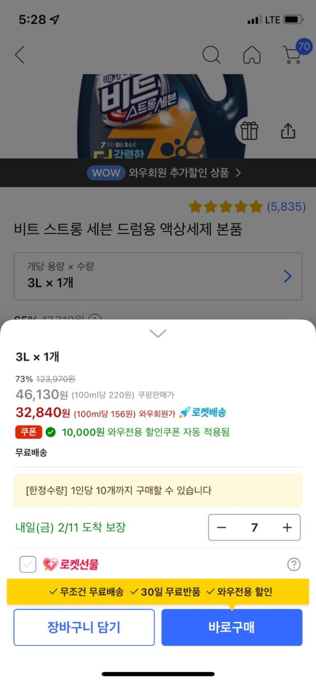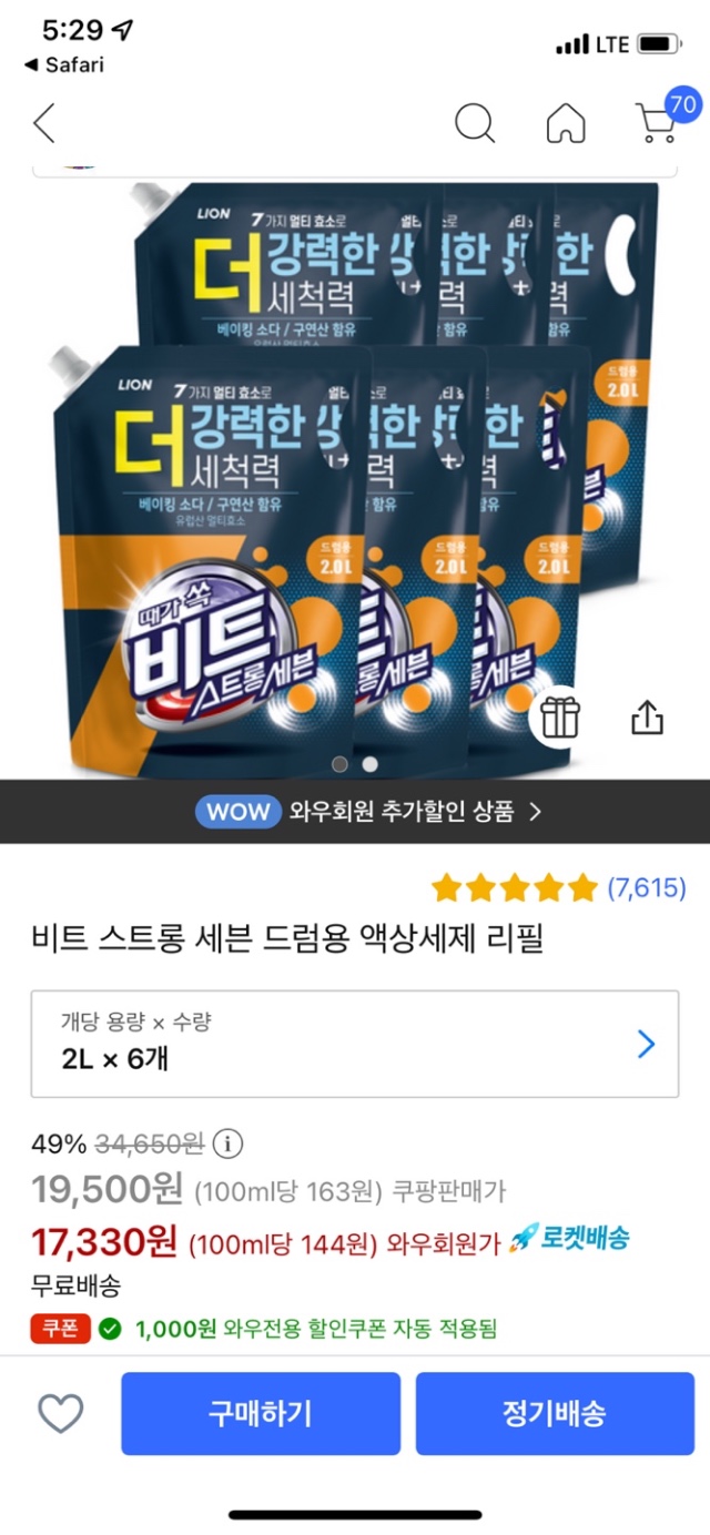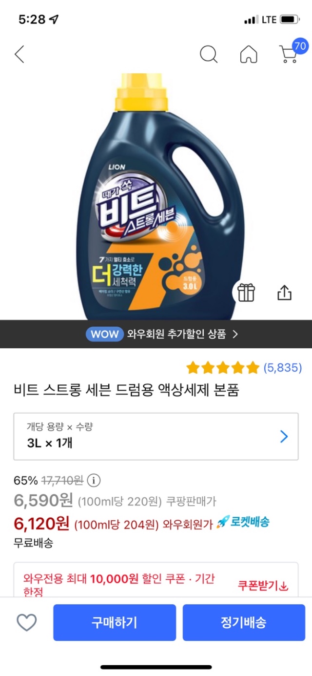 쿠팡)비트 스트롱세븐 드럼용 액상세제 3L 7개 32,840원